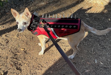 Julia had not seen Baxter for several years and figured he would not remember her. He did. This year, based on local reports of coyote attacks on small dogs, even being walked by humans, I got him a “coyote vest.” He occasionally is “armored up” when we go out for a walk.