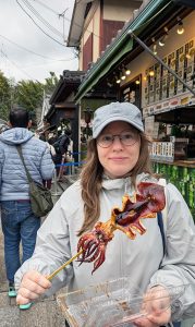 As I write this in mid-December, Julia and Sam are in Japan . . . for the second time this year (third for Sam). They spent time in Tokyo/Kyoto in Feb/Mar, Sam went back in the summer to climb Mt. Fuji, and this time they’re focusing on Hokkaido. Here’s Julia with “squid on a stick.”